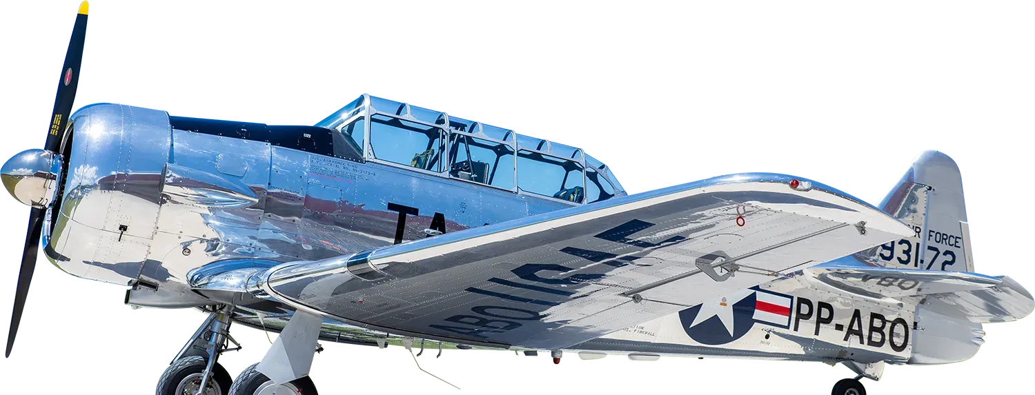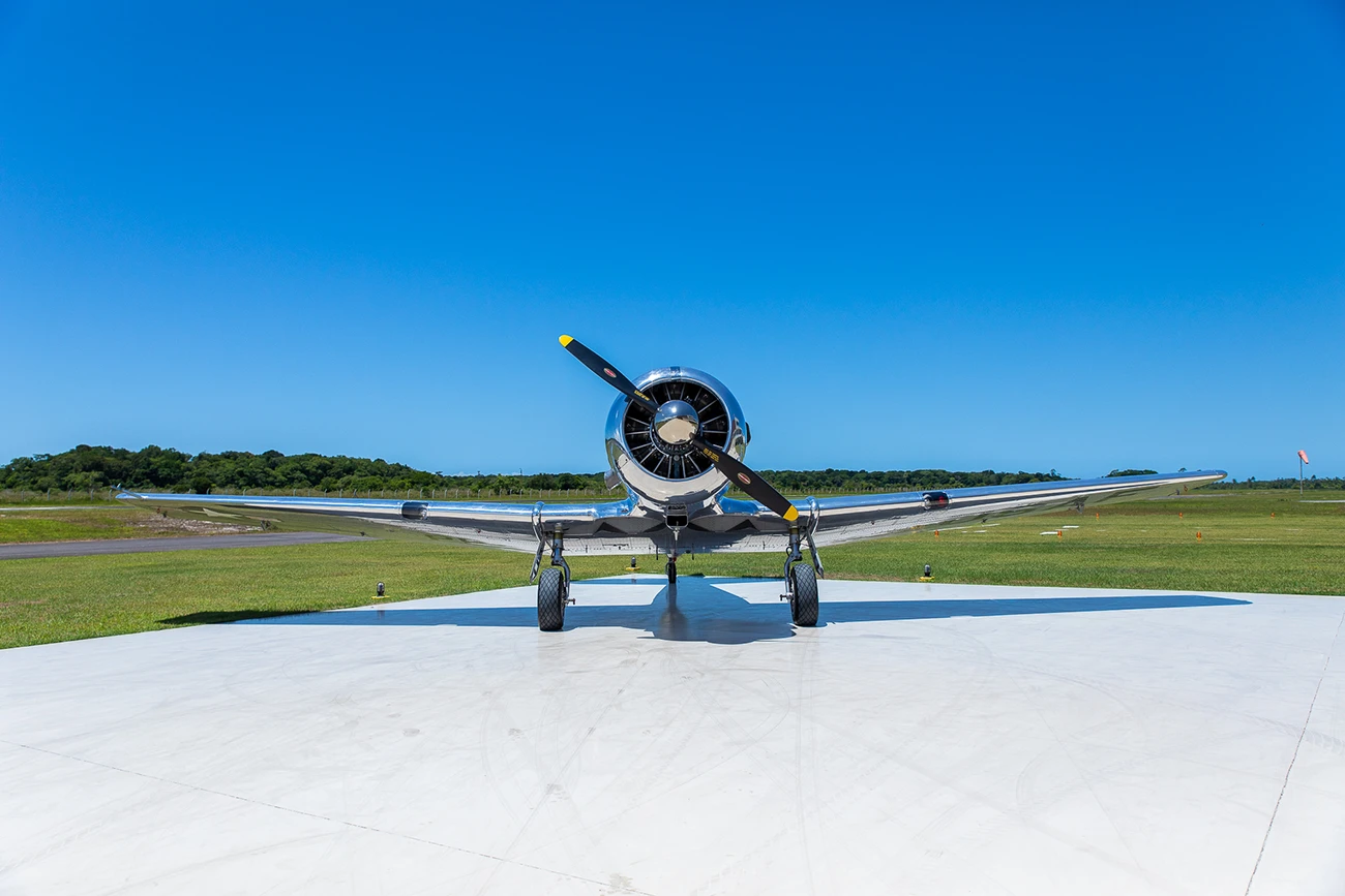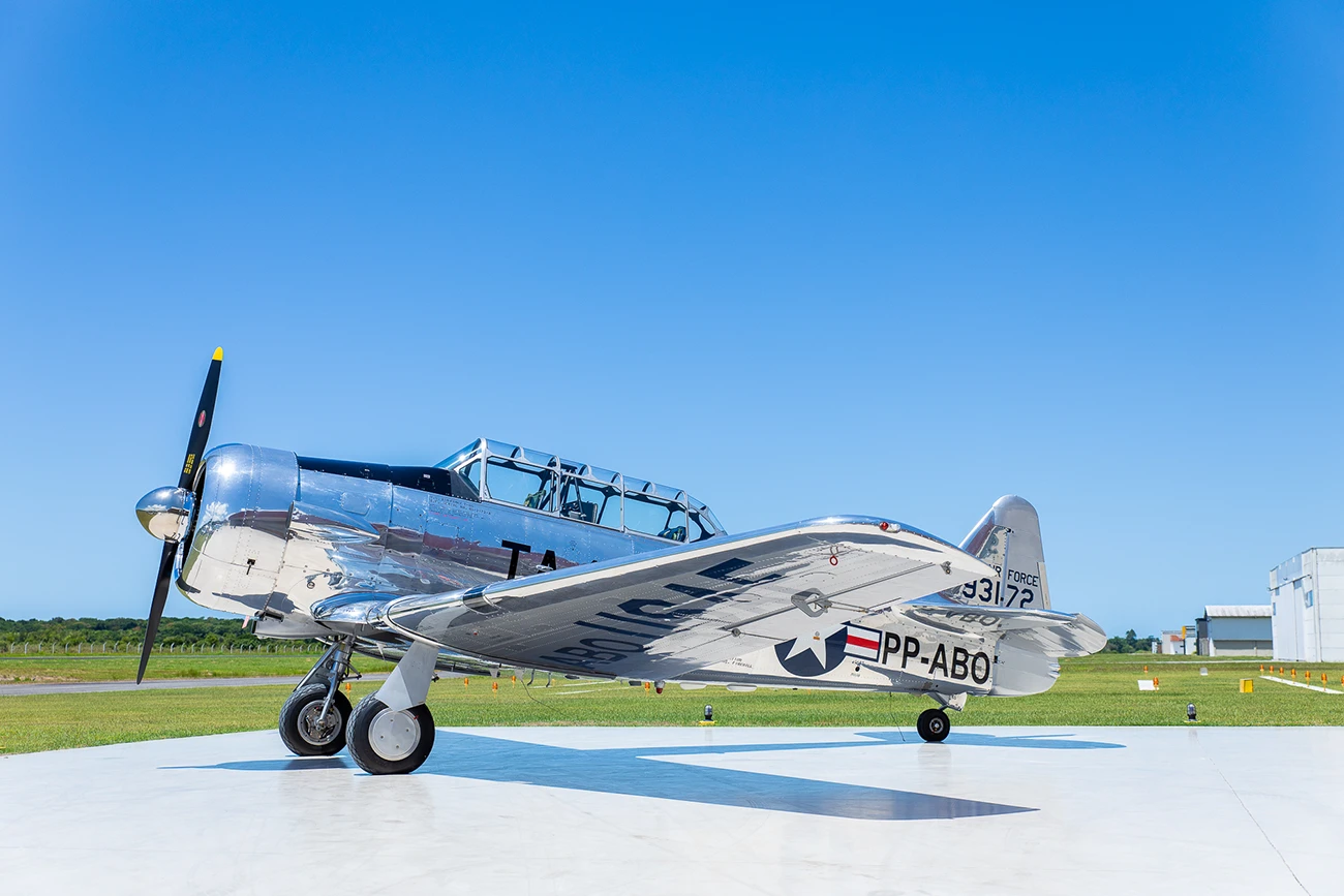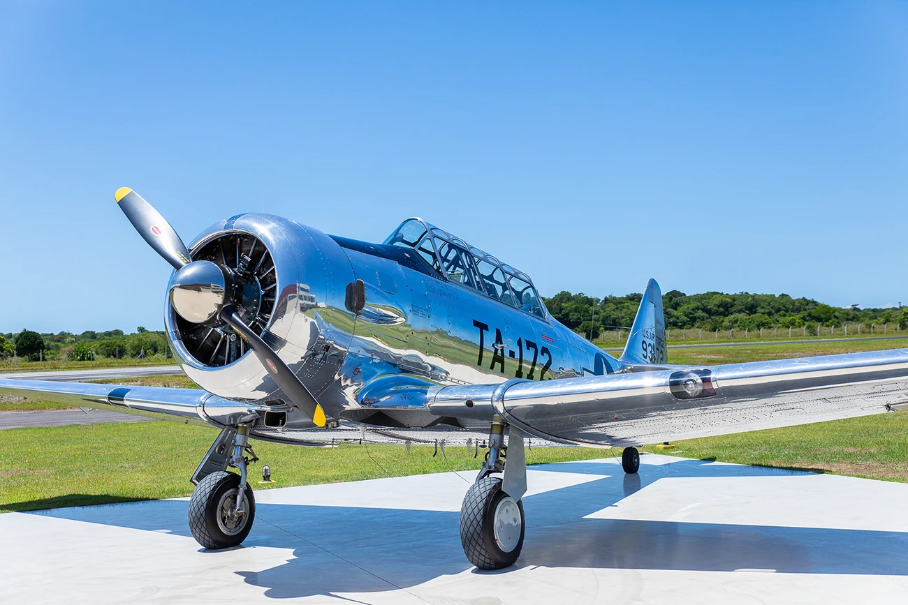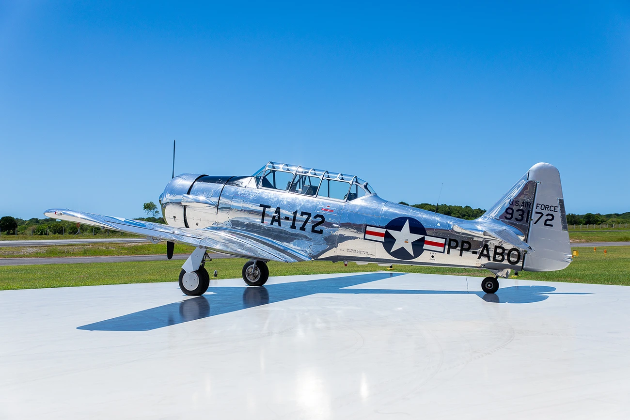 O exemplar do acervo foi recebido pela então USAAF (United States Army Air Force, Força Aérea do Exército dos Estados Unidos) em 1942, saindo de fábrica como um treinador Texan da versão T-6C, e como tal foi usado para instrução primária em diversas bases da USAAF até 1949, com o número de serviço 32380, quando foi retirado do inventário para conversão em T-6G, na North American Aviation em Dallas, Texas (EUA), daí a sua plaqueta sob o estabilizador horizontal referindo-se a 25 de janeiro de 1949 como “data de fabricação” (quando ficou pronto), e com o C/n 49-3172A – de fato, foi o ano de conversão para o novo padrão T-6G, sendo entregue a USAF em 1951 – lembrando-se que, em 1947, a antiga USAAF conquistou a sua total autonomia como Arma, tornando-se a USAF (United States Air Force, Força Aérea dos Estados Unidos). Assim, o aparelho voltou a servir em várias bases aéreas no território continental norte-americano, até 1956, quando foi retirado de serviço, e colocado em estoque como excedente.